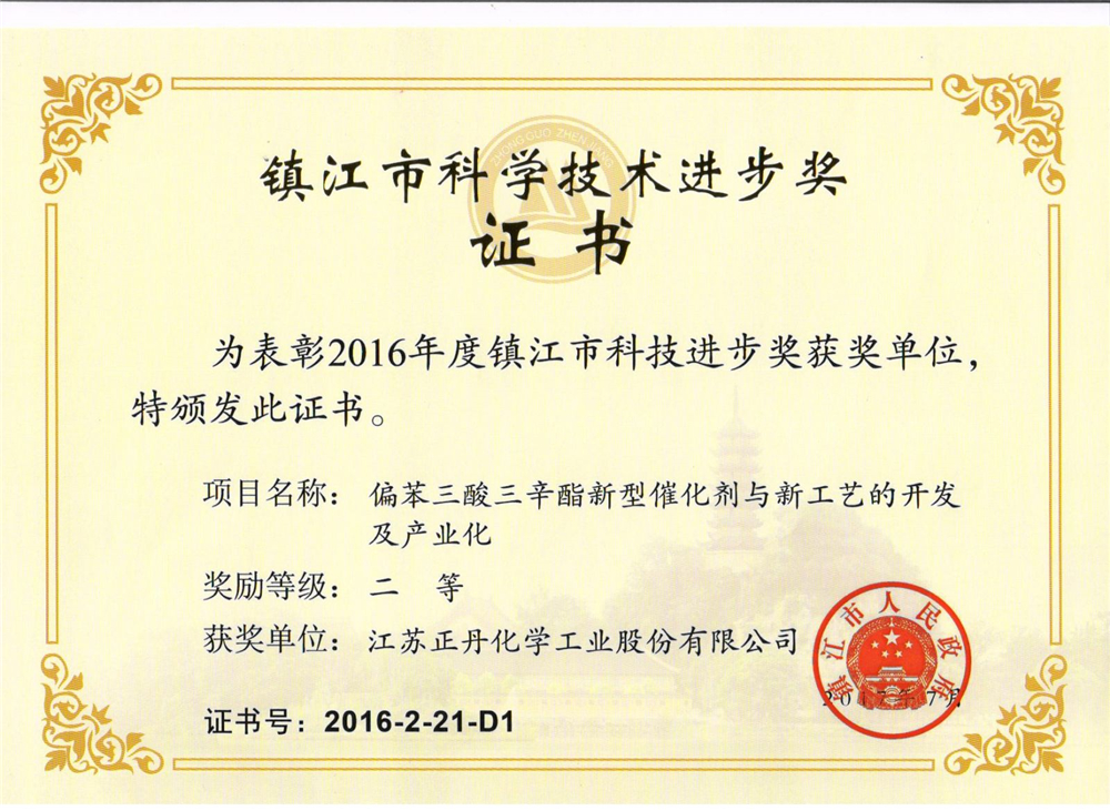 江蘇正丹化學(xué)工業(yè)股份有限公司作為國內(nèi)主要的偏苯三酸三辛酯生產(chǎn)企業(yè),一直致力于偏苯三酸三辛酯生產(chǎn)技術(shù)的改進(jìn)和工藝優(yōu)化,提高企業(yè)核心競爭力。公司組織科研技術(shù)力量,經(jīng)過不懈努力、反復(fù)攻關(guān),實(shí)現(xiàn)了一種綠色催化合成偏苯三酸三辛酯的新工藝,并形成多項(xiàng)自主知識(shí)產(chǎn)權(quán)(獲得國家授權(quán)發(fā)明專利2項(xiàng),實(shí)用新型專利1項(xiàng))。公司將專利技術(shù)進(jìn)行成果轉(zhuǎn)化,成功實(shí)施“偏苯三酸三辛酯新型催化劑與新工藝的開發(fā)及產(chǎn)業(yè)化”項(xiàng)目并獲得“2016年度鎮(zhèn)江市科學(xué)技術(shù)進(jìn)步獎(jiǎng) 二等獎(jiǎng)”。