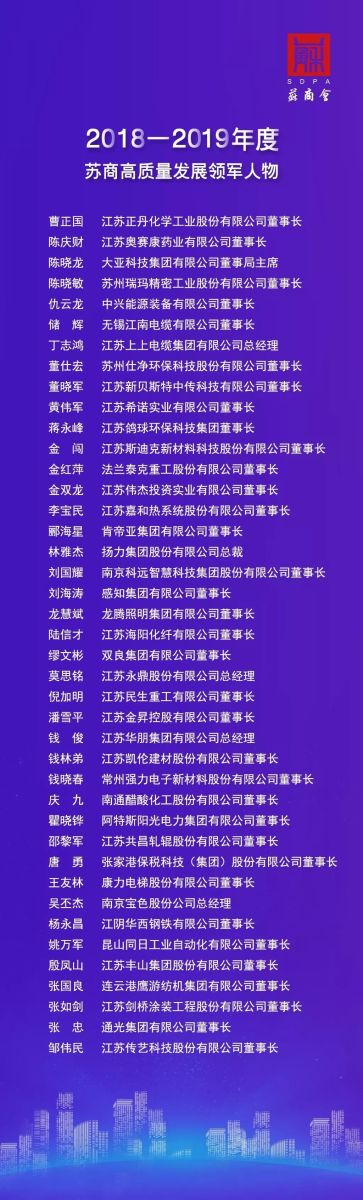 在本次大會上,為表彰江蘇高質(zhì)量發(fā)展中的推動者、領(lǐng)軍者,蘇商會頒發(fā)了“2018-2019年度蘇商高質(zhì)量發(fā)展領(lǐng)軍人物”獎。江蘇正丹化學(xué)工業(yè)股份有限公司董事長曹正國榮獲“2018-2019年度蘇商高質(zhì)量發(fā)展領(lǐng)軍人物”稱號。